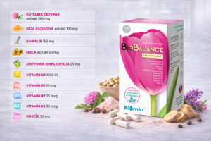 Príkladom je BioBalance MENOPAUSE, ktorý obsahuje fytoestrogény, adaptogény ako maca či baikalín a vitamíny dôležité pre hormonálnu rovnováhu.